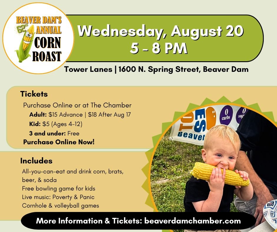 It’s Official – the Corn is Coming! Beaver Dam’s 62nd Annual Corn Roast is rolling into Tower Lanes Beaver Dam on Wednesday, August 20 from 5–8 PM, and you won’t want to miss it!
